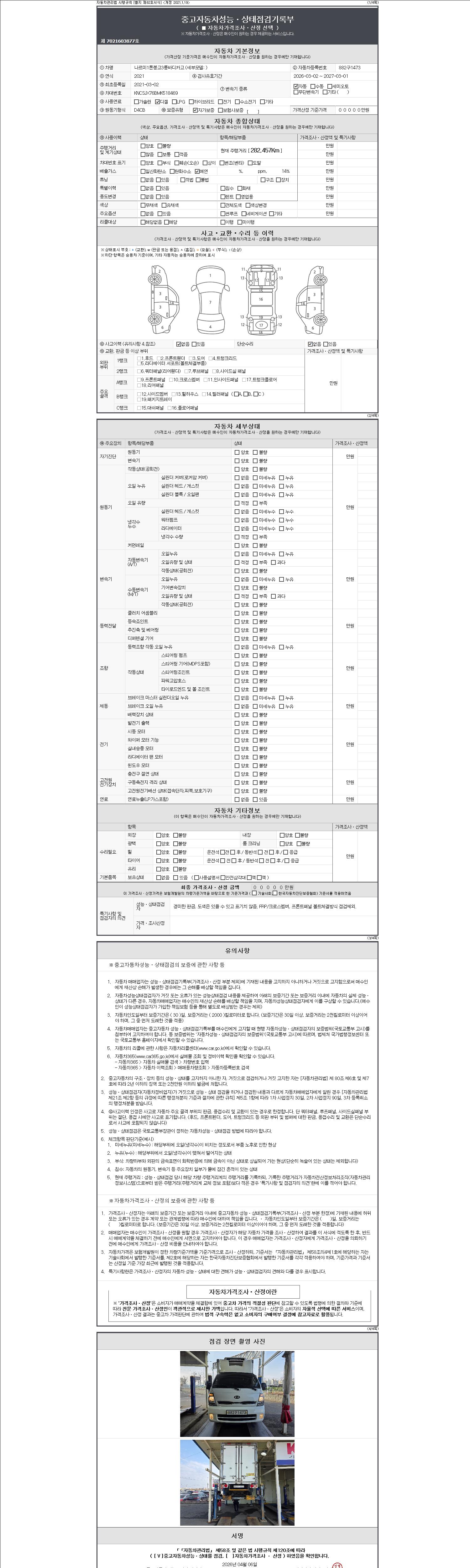자동차관리법 시행규칙 제120조의 규정에 따라 별지 제 82호서식 《중고자동차 성능, 상태점검 기록부》를 발행한 성능, 상태점검자 및 매매자는 아래의 보증기간 또는 보증거리 이내의 중고자동차, 성능점검 기록부에 기재된 내용과 자동차의 실제 성능, 상태가 다른 경우 계약 또는 관계법령에 따라 매수인에 대하여 책임을 집니다.