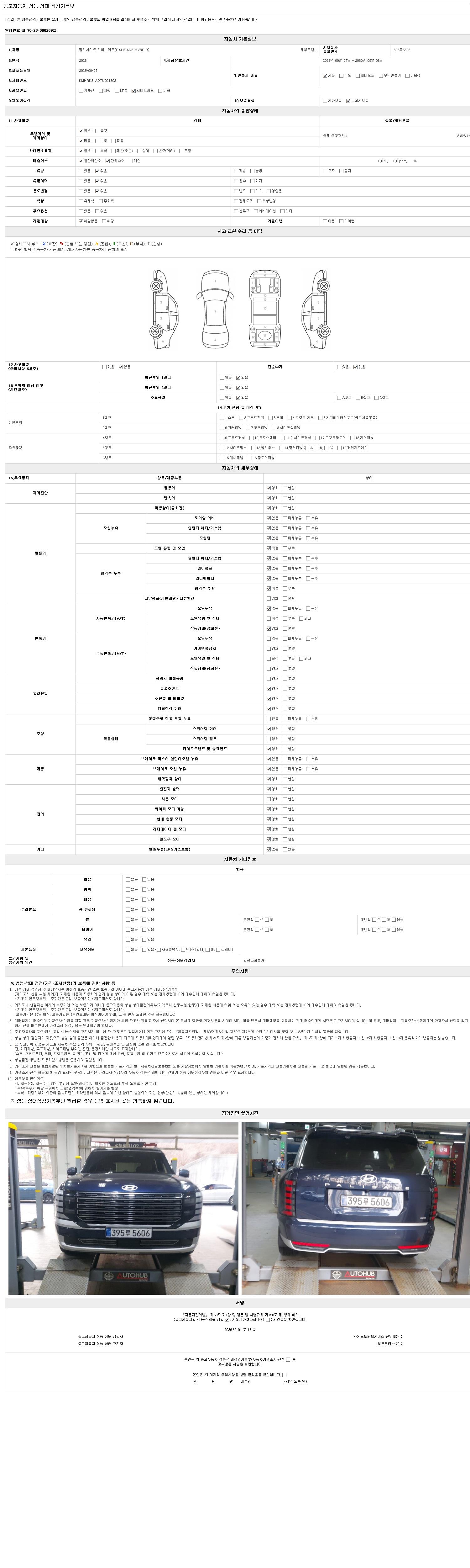 자동차관리법 시행규칙 제120조의 규정에 따라 별지 제 82호서식 《중고자동차 성능, 상태점검 기록부》를 발행한 성능, 상태점검자 및 매매자는 아래의 보증기간 또는 보증거리 이내의 중고자동차, 성능점검 기록부에 기재된 내용과 자동차의 실제 성능, 상태가 다른 경우 계약 또는 관계법령에 따라 매수인에 대하여 책임을 집니다.