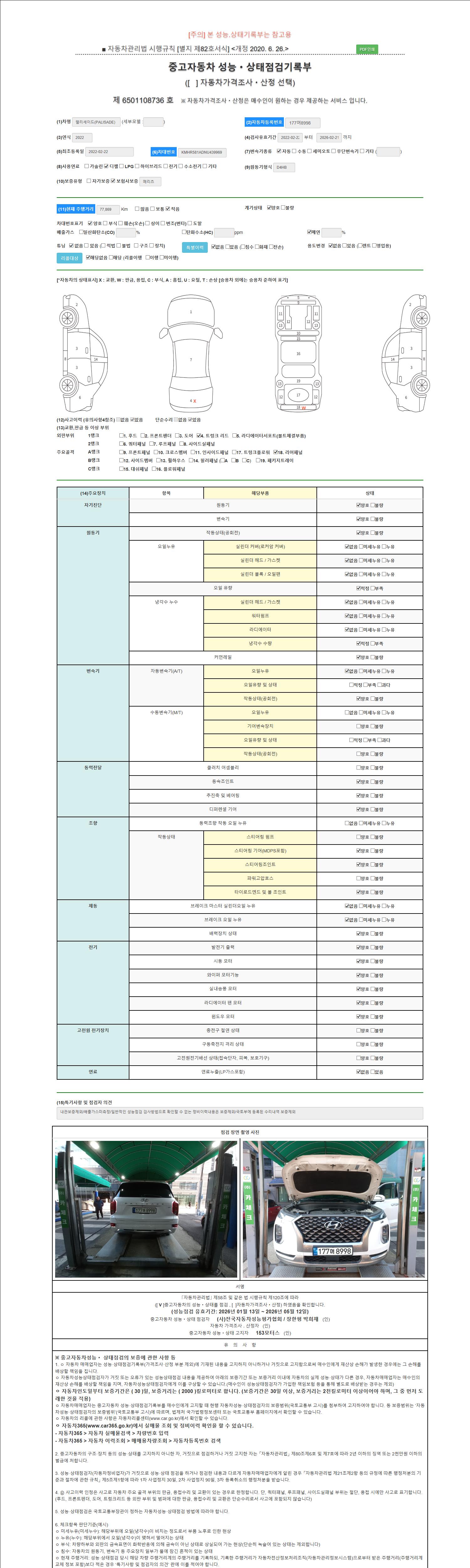 2. 차량 등록증이나 성능점검지 등을 상담자에게 요청및 확인하시고 사전에 미리 점검 하시기를 권유드립니다.