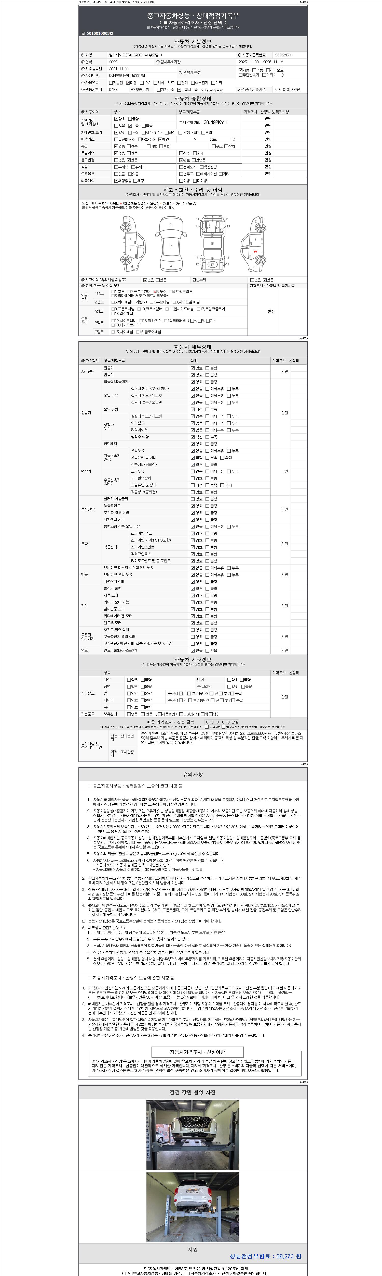 자동차관리법 시행규칙 제120조의 규정에 따라 별지 제 82호서식 《중고자동차 성능, 상태점검 기록부》를 발행한 성능, 상태점검자 및 매매자는 아래의 보증기간 또는 보증거리 이내의 중고자동차, 성능점검 기록부에 기재된 내용과 자동차의 실제 성능, 상태가 다른 경우 계약 또는 관계법령에 따라 매수인에 대하여 책임을 집니다.