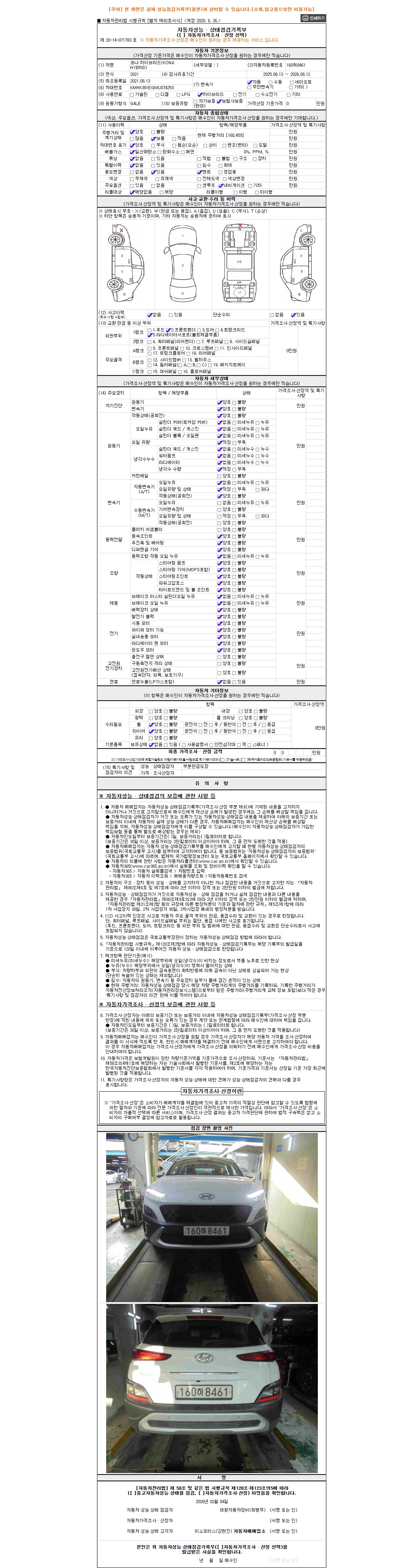 -중고자동차 매매업자를 통해 차량을 구입하실 경우 반드시 "중고자동차 성능, 상태점검 기록부"를 교뷰 받으셔야 하며, 매매업자는 반드시 의무 교부 하여야 압니다.