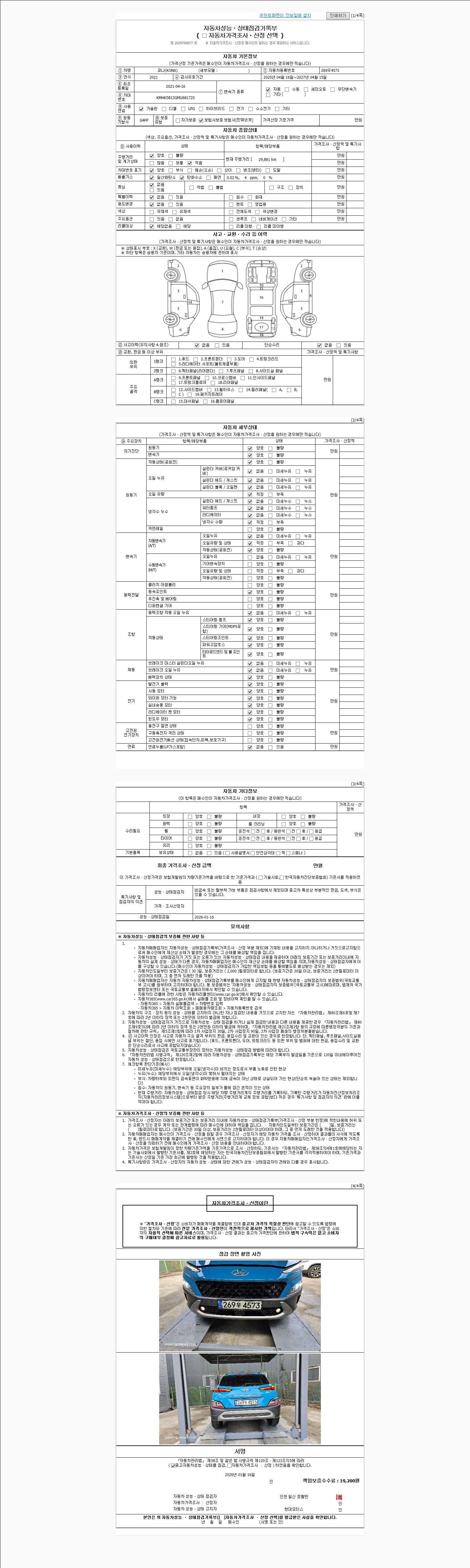 자동차관리법 시행규칙 제120조의 규정에 따라 별지 제 82호서식 《중고자동차 성능, 상태점검 기록부》를 발행한 성능, 상태점검자 및 매매자는 아래의 보증기간 또는 보증거리 이내의 중고자동차, 성능점검 기록부에 기재된 내용과 자동차의 실제 성능, 상태가 다른 경우 계약 또는 관계법령에 따라 매수인에 대하여 책임을 집니다.