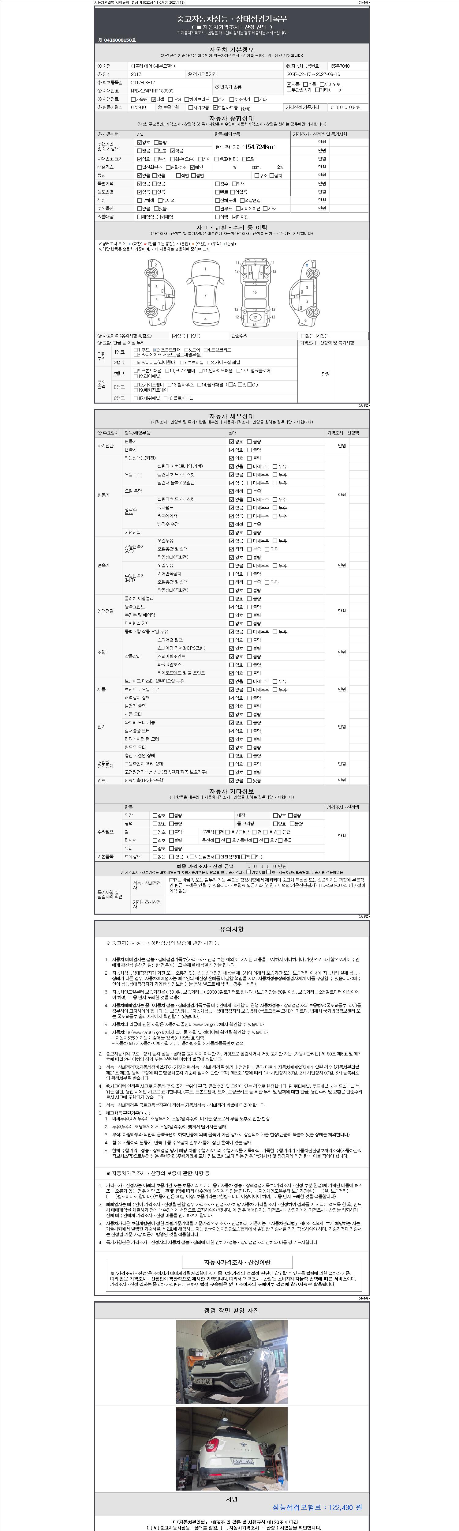 자동차관리법 시행규칙 제120조의 규정에 따라 별지 제 82호서식 《중고자동차 성능, 상태점검 기록부》를 발행한 성능, 상태점검자 및 매매자는 아래의 보증기간 또는 보증거리 이내의 중고자동차, 성능점검 기록부에 기재된 내용과 자동차의 실제 성능, 상태가 다른 경우 계약 또는 관계법령에 따라 매수인에 대하여 책임을 집니다.