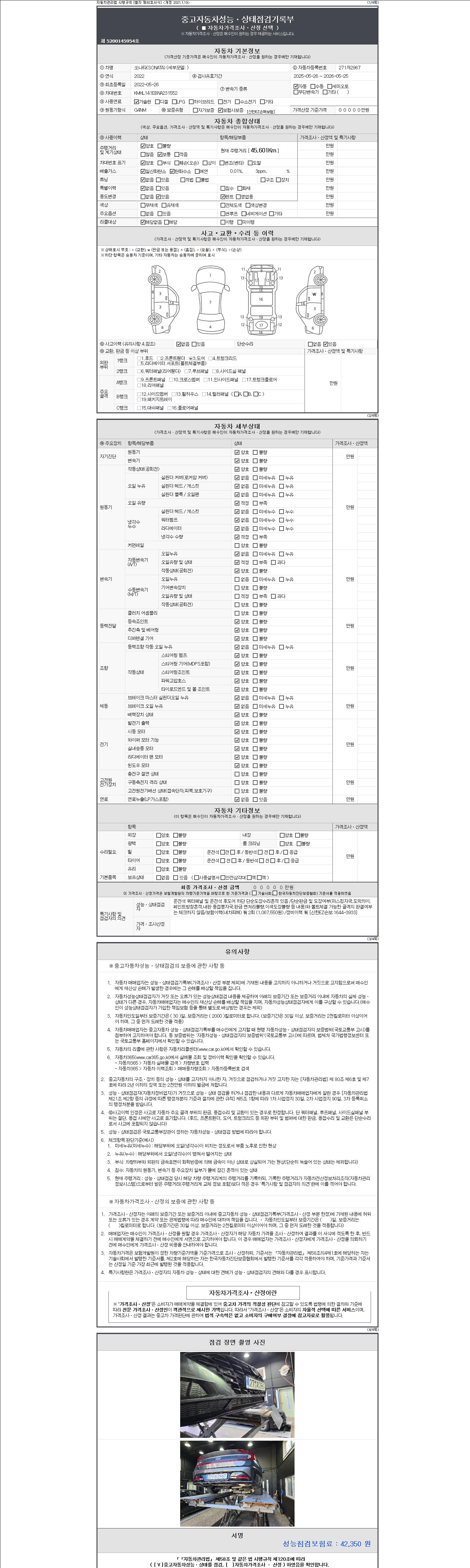 자동차관리법 시행규칙 제120조의 규정에 따라 별지 제 82호서식 《중고자동차 성능, 상태점검 기록부》를 발행한 성능, 상태점검자 및 매매자는 아래의 보증기간 또는 보증거리 이내의 중고자동차, 성능점검 기록부에 기재된 내용과 자동차의 실제 성능, 상태가 다른 경우 계약 또는 관계법령에 따라 매수인에 대하여 책임을 집니다.