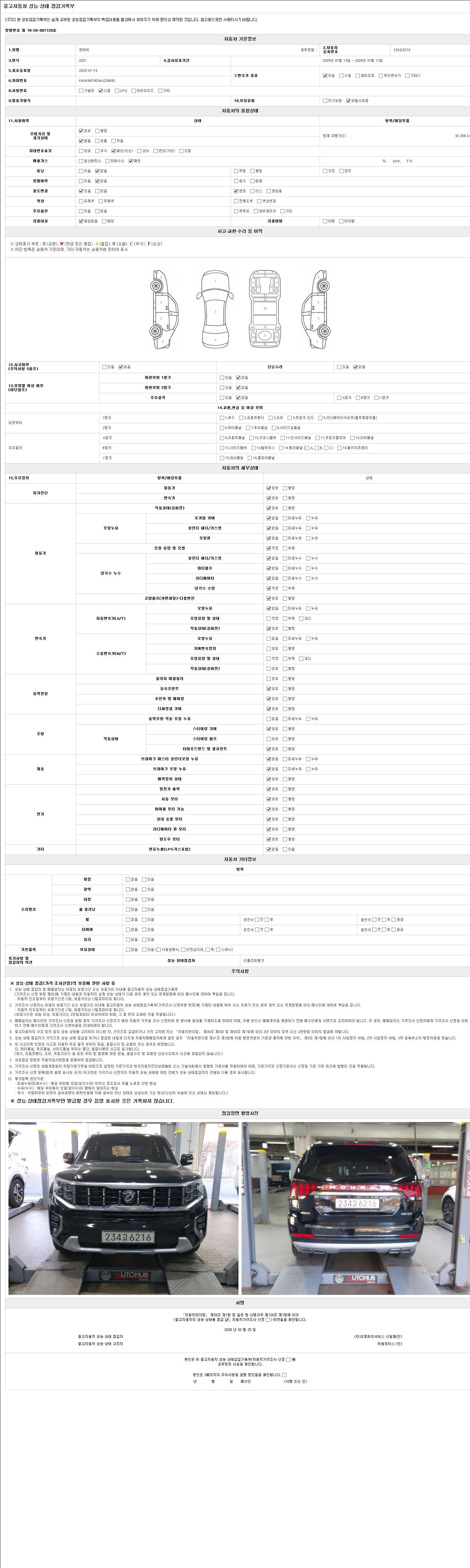 자동차관리법 시행규칙 제120조의 규정에 따라 별지 제 82호서식 《중고자동차 성능, 상태점검 기록부》를 발행한 성능, 상태점검자 및 매매자는 아래의 보증기간 또는 보증거리 이내의 중고자동차, 성능점검 기록부에 기재된 내용과 자동차의 실제 성능, 상태가 다른 경우 계약 또는 관계법령에 따라 매수인에 대하여 책임을 집니다.