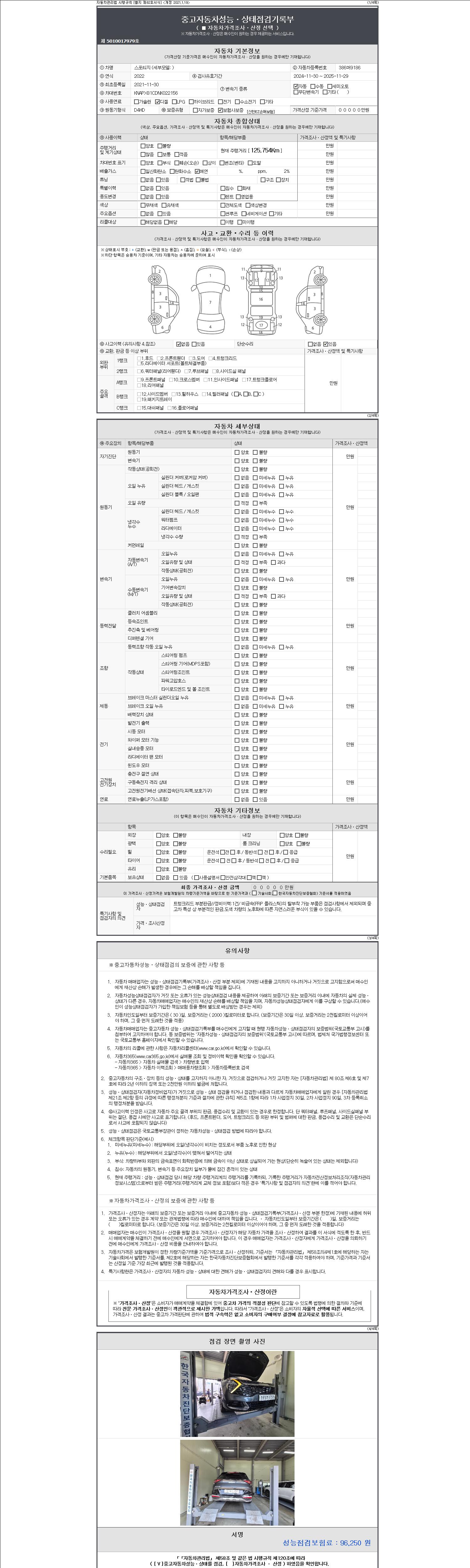 자동차관리법 시행규칙 제120조의 규정에 따라 별지 제 82호서식 《중고자동차 성능, 상태점검 기록부》를 발행한 성능, 상태점검자 및 매매자는 아래의 보증기간 또는 보증거리 이내의 중고자동차, 성능점검 기록부에 기재된 내용과 자동차의 실제 성능, 상태가 다른 경우 계약 또는 관계법령에 따라 매수인에 대하여 책임을 집니다.