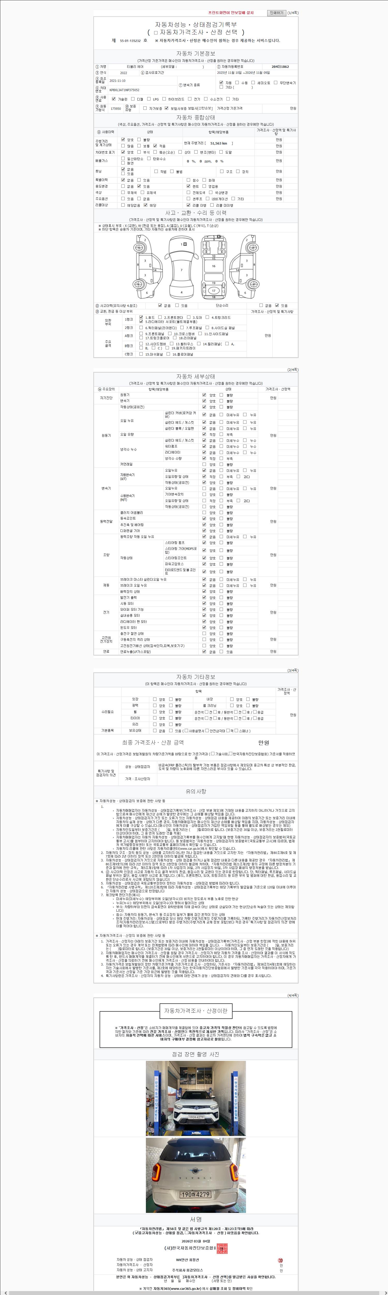 -중고자동차 매매업자를 통해 차량을 구입하실 경우 반드시 "중고자동차 성능, 상태점검 기록부"를 교뷰 받으셔야 하며, 매매업자는 반드시 의무 교부 하여야 압니다.