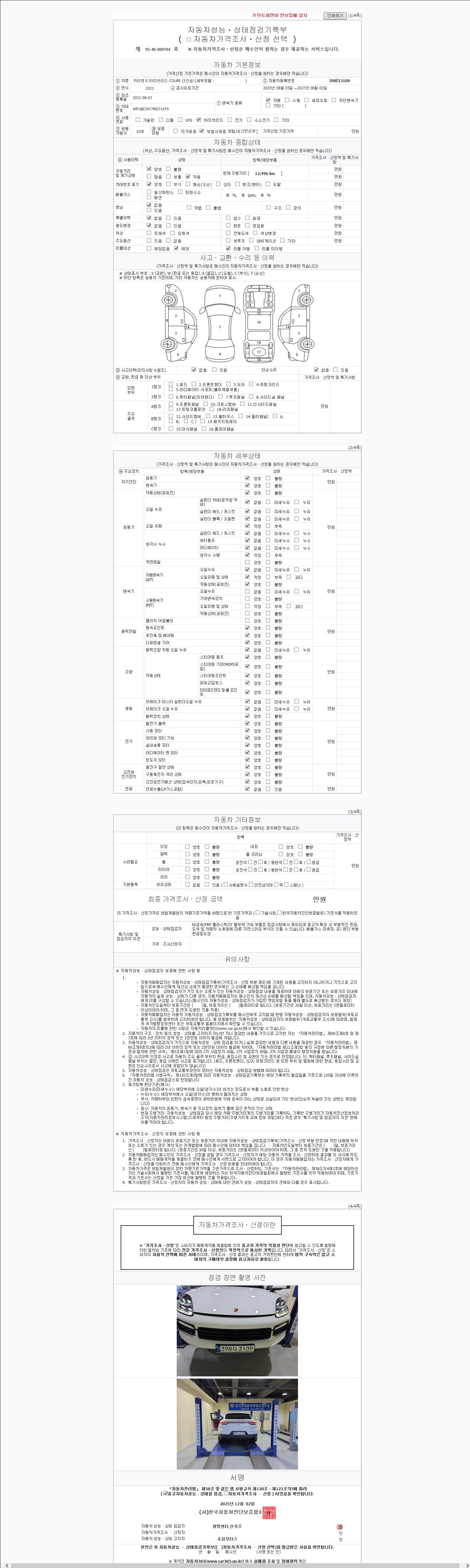 자동차관리법 시행규칙 제120조의 규정에 따라 별지 제 82호서식 《중고자동차 성능, 상태점검 기록부》를 발행한 성능, 상태점검자 및 매매자는 아래의 보증기간 또는 보증거리 이내의 중고자동차, 성능점검 기록부에 기재된 내용과 자동차의 실제 성능, 상태가 다른 경우 계약 또는 관계법령에 따라 매수인에 대하여 책임을 집니다.