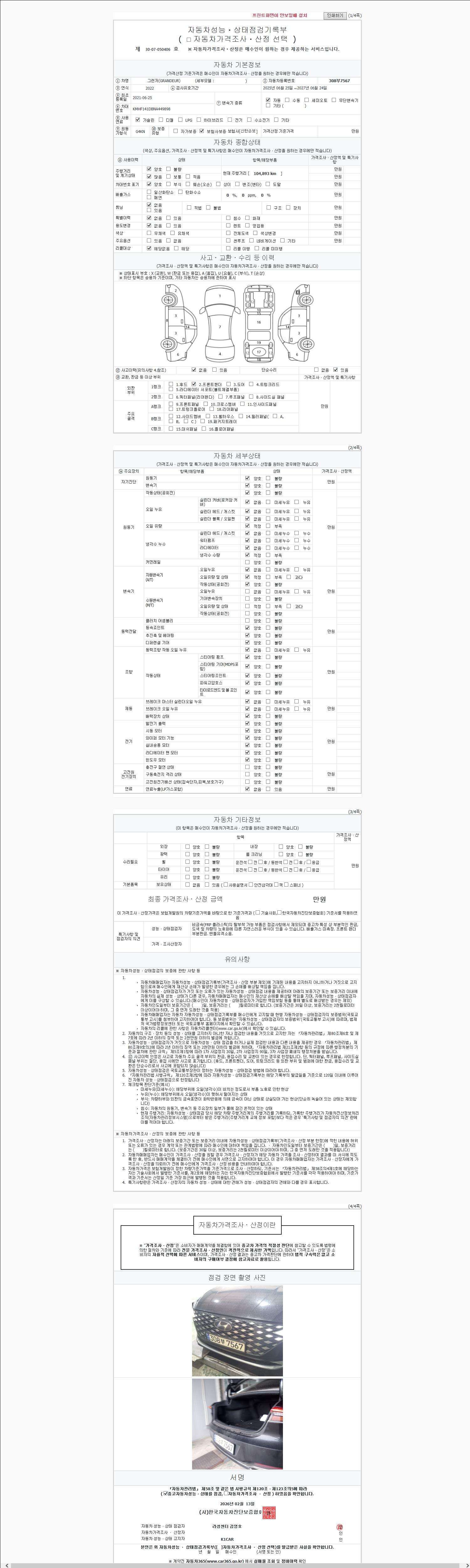 자동차관리법 시행규칙 제120조의 규정에 따라 별지 제 82호서식 《중고자동차 성능, 상태점검 기록부》를 발행한 성능, 상태점검자 및 매매자는 아래의 보증기간 또는 보증거리 이내의 중고자동차, 성능점검 기록부에 기재된 내용과 자동차의 실제 성능, 상태가 다른 경우 계약 또는 관계법령에 따라 매수인에 대하여 책임을 집니다.