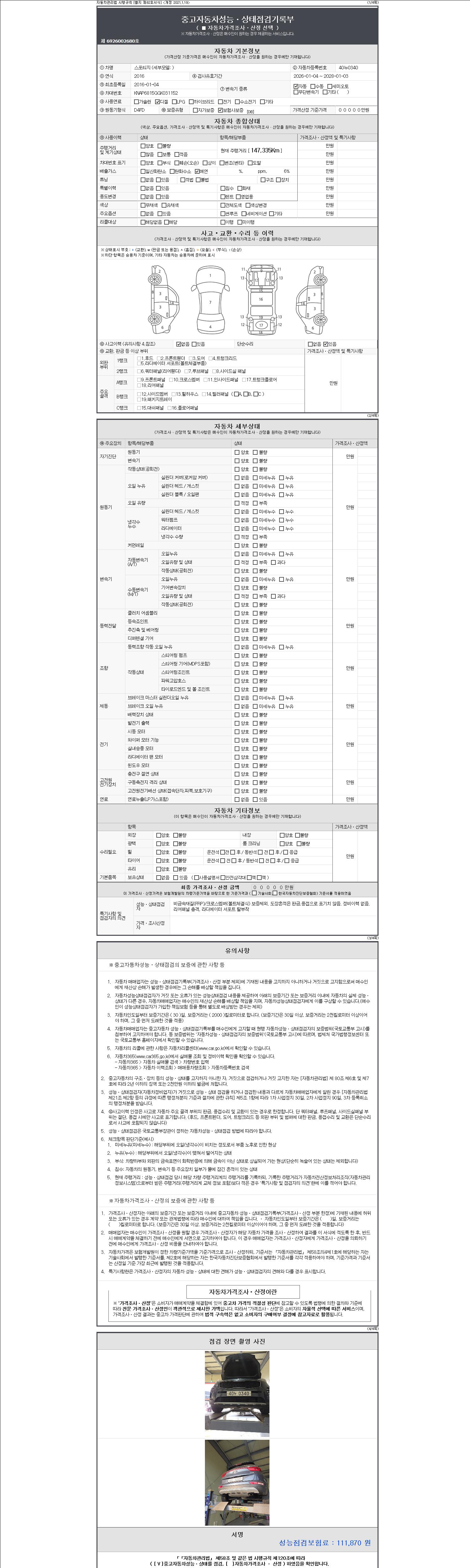 자동차관리법 시행규칙 제120조의 규정에 따라 별지 제 82호서식 《중고자동차 성능, 상태점검 기록부》를 발행한 성능, 상태점검자 및 매매자는 아래의 보증기간 또는 보증거리 이내의 중고자동차, 성능점검 기록부에 기재된 내용과 자동차의 실제 성능, 상태가 다른 경우 계약 또는 관계법령에 따라 매수인에 대하여 책임을 집니다.