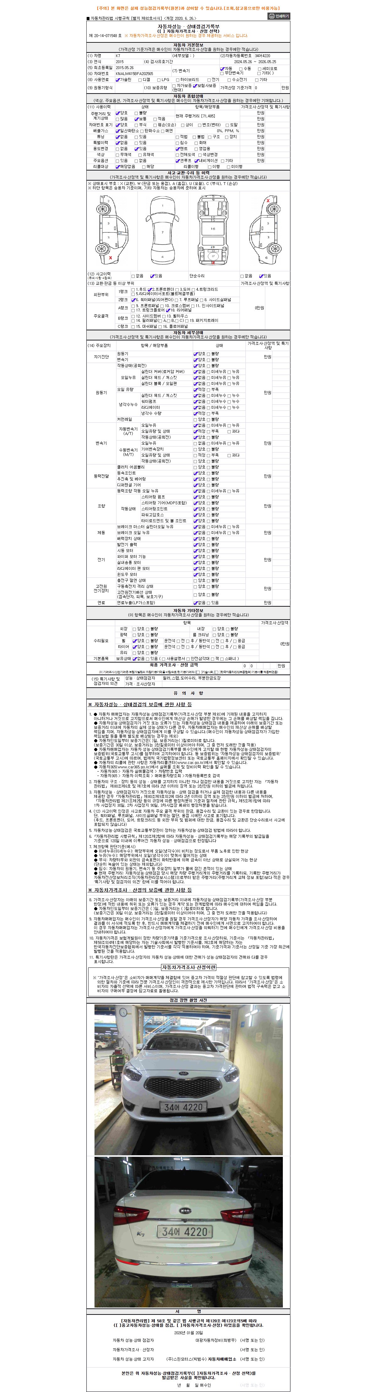 자동차관리법 시행규칙 제120조의 규정에 따라 별지 제 82호서식 《중고자동차 성능, 상태점검 기록부》를 발행한 성능, 상태점검자 및 매매자는 아래의 보증기간 또는 보증거리 이내의 중고자동차, 성능점검 기록부에 기재된 내용과 자동차의 실제 성능, 상태가 다른 경우 계약 또는 관계법령에 따라 매수인에 대하여 책임을 집니다.