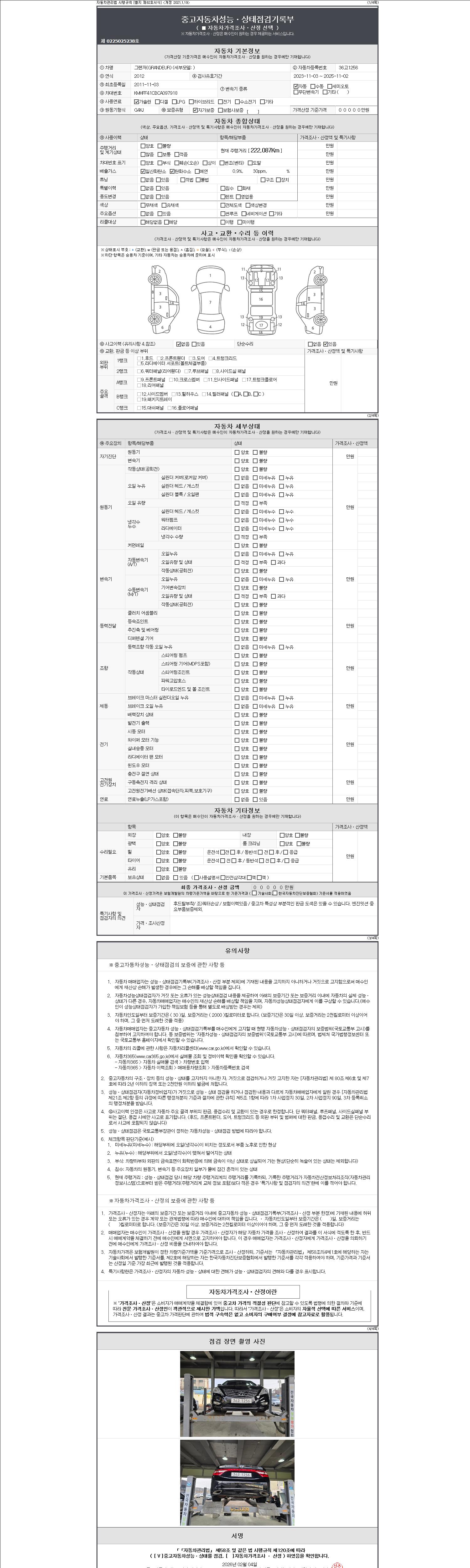 -중고자동차 매매업자를 통해 차량을 구입하실 경우 반드시 "중고자동차 성능, 상태점검 기록부"를 교뷰 받으셔야 하며, 매매업자는 반드시 의무 교부 하여야 압니다.