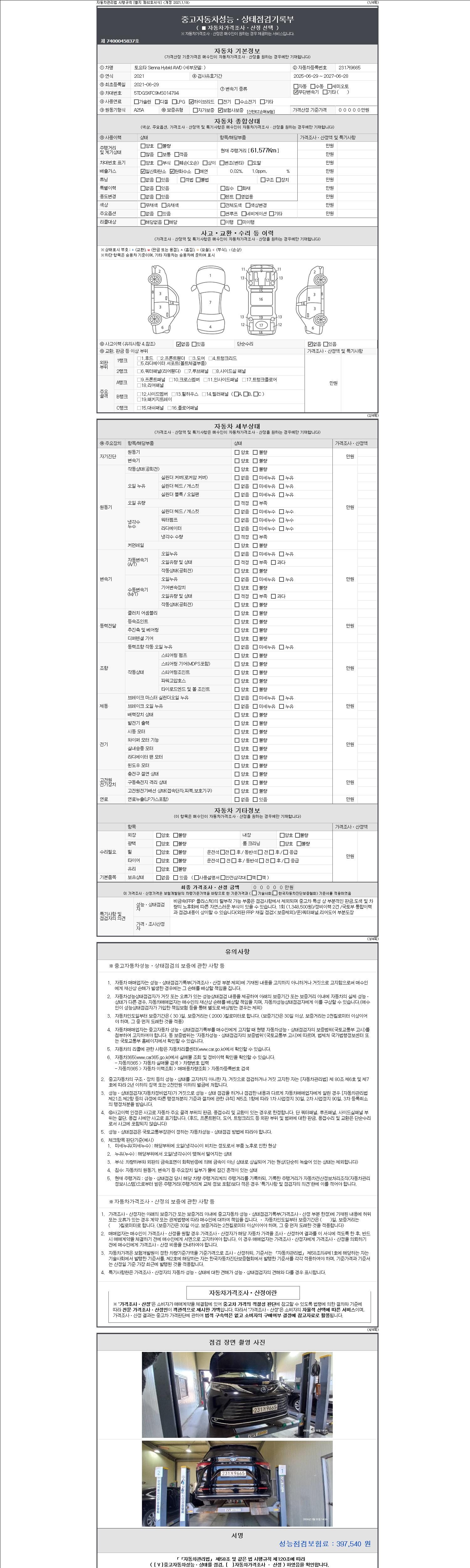 자동차관리법 시행규칙 제120조의 규정에 따라 별지 제 82호서식 《중고자동차 성능, 상태점검 기록부》를 발행한 성능, 상태점검자 및 매매자는 아래의 보증기간 또는 보증거리 이내의 중고자동차, 성능점검 기록부에 기재된 내용과 자동차의 실제 성능, 상태가 다른 경우 계약 또는 관계법령에 따라 매수인에 대하여 책임을 집니다.