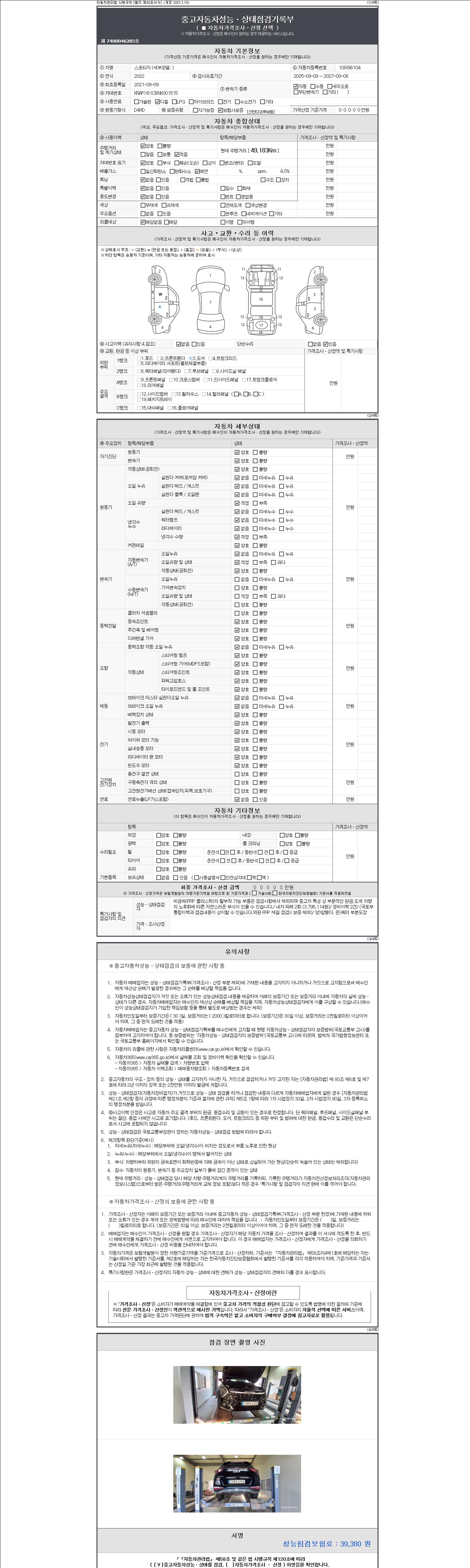 자동차관리법 시행규칙 제120조의 규정에 따라 별지 제 82호서식 《중고자동차 성능, 상태점검 기록부》를 발행한 성능, 상태점검자 및 매매자는 아래의 보증기간 또는 보증거리 이내의 중고자동차, 성능점검 기록부에 기재된 내용과 자동차의 실제 성능, 상태가 다른 경우 계약 또는 관계법령에 따라 매수인에 대하여 책임을 집니다.
