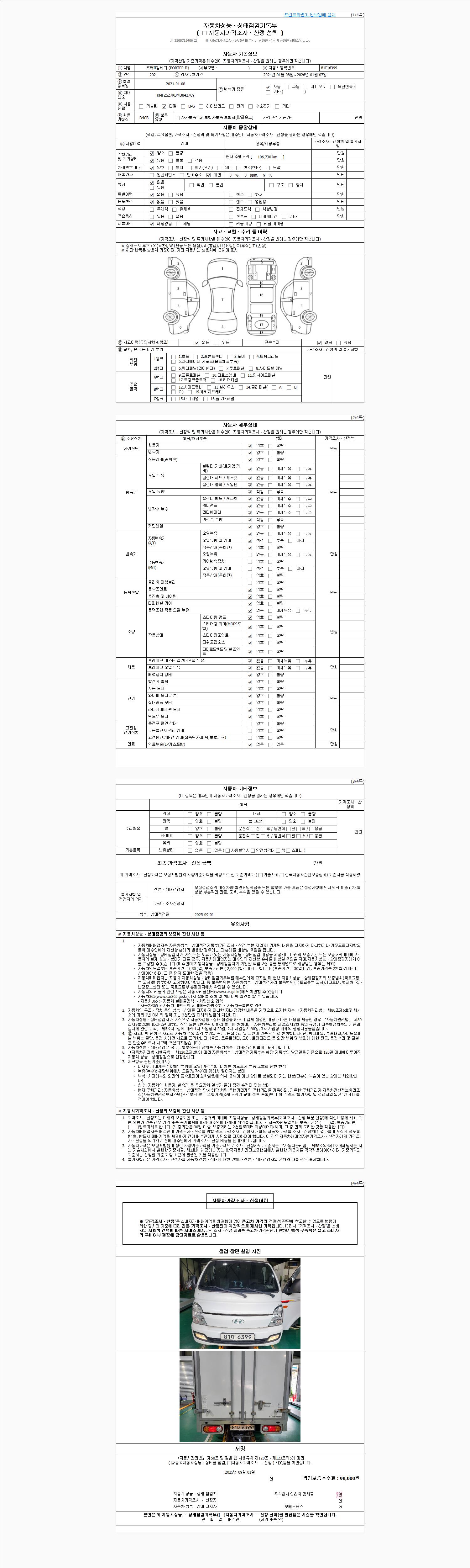 자동차관리법 시행규칙 제120조의 규정에 따라 별지 제 82호서식 《중고자동차 성능, 상태점검 기록부》를 발행한 성능, 상태점검자 및 매매자는 아래의 보증기간 또는 보증거리 이내의 중고자동차, 성능점검 기록부에 기재된 내용과 자동차의 실제 성능, 상태가 다른 경우 계약 또는 관계법령에 따라 매수인에 대하여 책임을 집니다.
