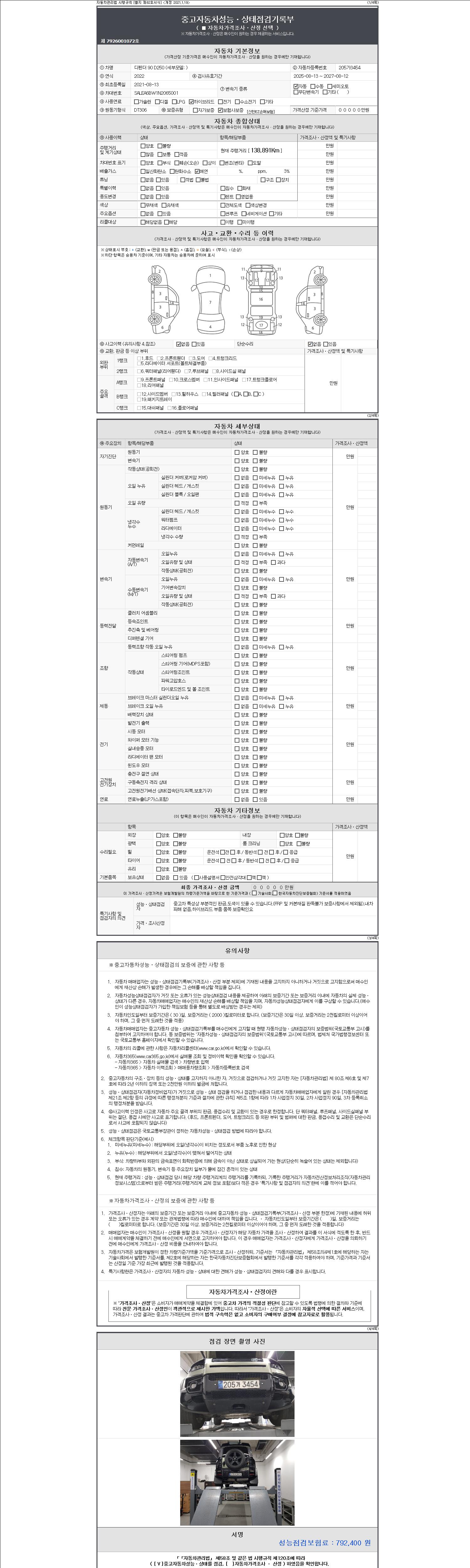 자동차관리법 시행규칙 제120조의 규정에 따라 별지 제 82호서식 《중고자동차 성능, 상태점검 기록부》를 발행한 성능, 상태점검자 및 매매자는 아래의 보증기간 또는 보증거리 이내의 중고자동차, 성능점검 기록부에 기재된 내용과 자동차의 실제 성능, 상태가 다른 경우 계약 또는 관계법령에 따라 매수인에 대하여 책임을 집니다.