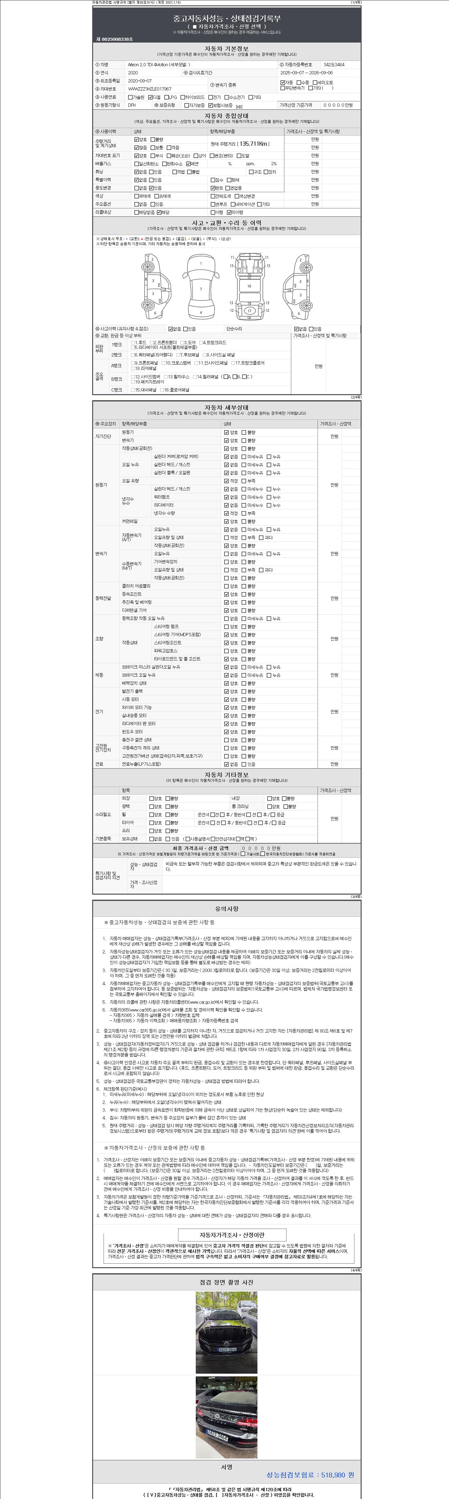 자동차관리법 시행규칙 제120조의 규정에 따라 별지 제 82호서식 《중고자동차 성능, 상태점검 기록부》를 발행한 성능, 상태점검자 및 매매자는 아래의 보증기간 또는 보증거리 이내의 중고자동차, 성능점검 기록부에 기재된 내용과 자동차의 실제 성능, 상태가 다른 경우 계약 또는 관계법령에 따라 매수인에 대하여 책임을 집니다.