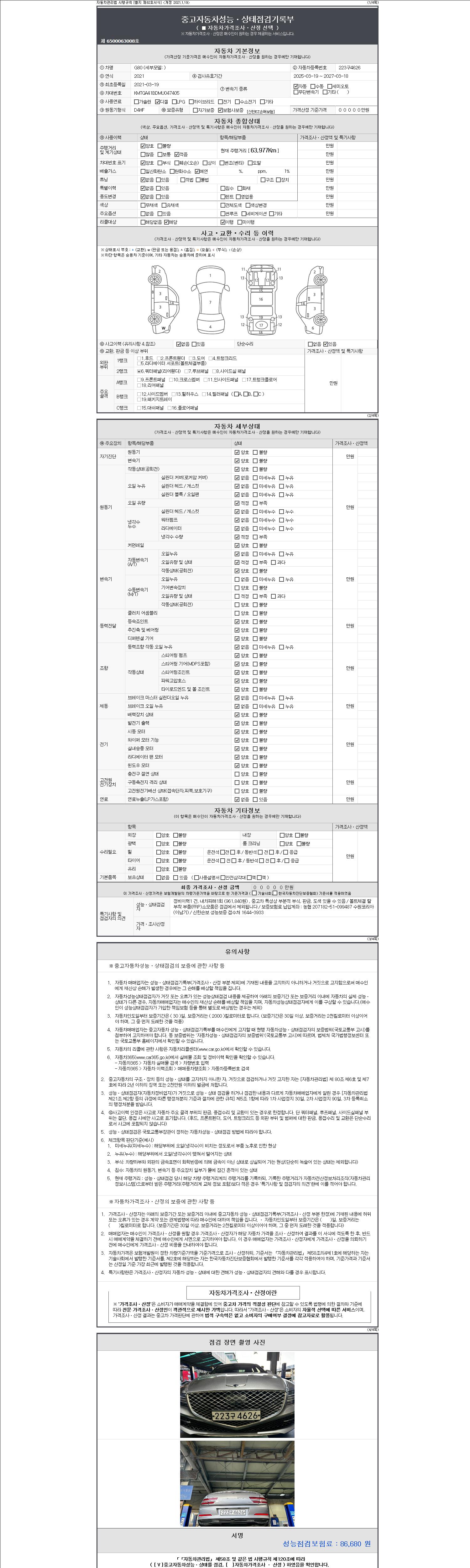 | 주행거리 | 63,977 km | 차량번호 | 223구4626 | 사고유무 | 성능기록부 참조 | 제시번호 | 제 2147483647 호 |