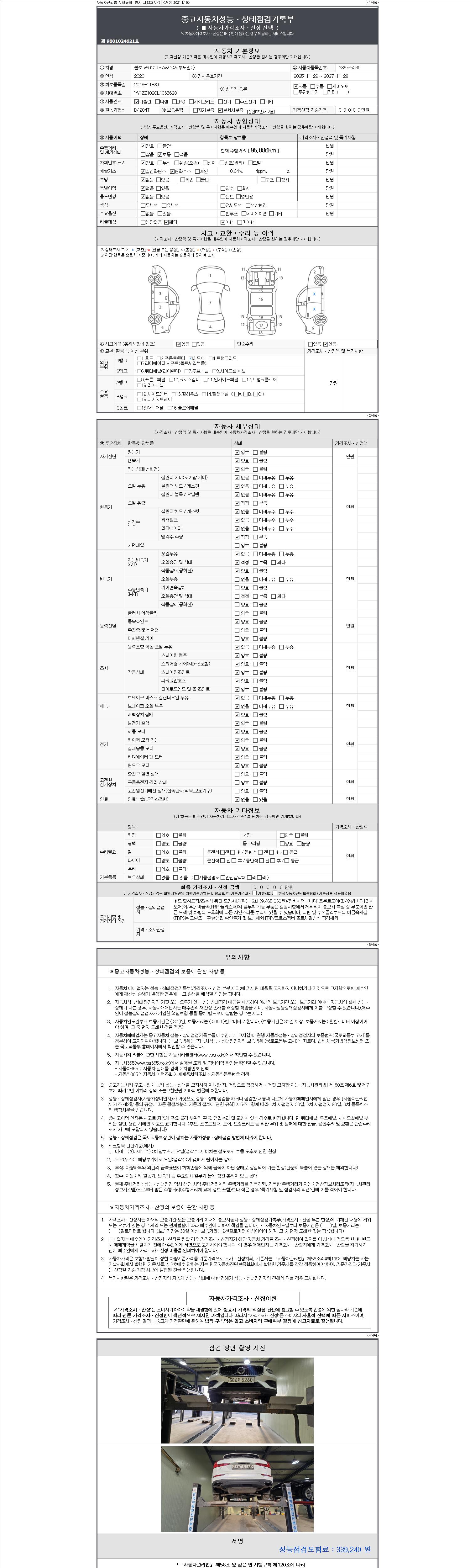 자동차관리법 시행규칙 제120조의 규정에 따라 별지 제 82호서식 《중고자동차 성능, 상태점검 기록부》를 발행한 성능, 상태점검자 및 매매자는 아래의 보증기간 또는 보증거리 이내의 중고자동차, 성능점검 기록부에 기재된 내용과 자동차의 실제 성능, 상태가 다른 경우 계약 또는 관계법령에 따라 매수인에 대하여 책임을 집니다.