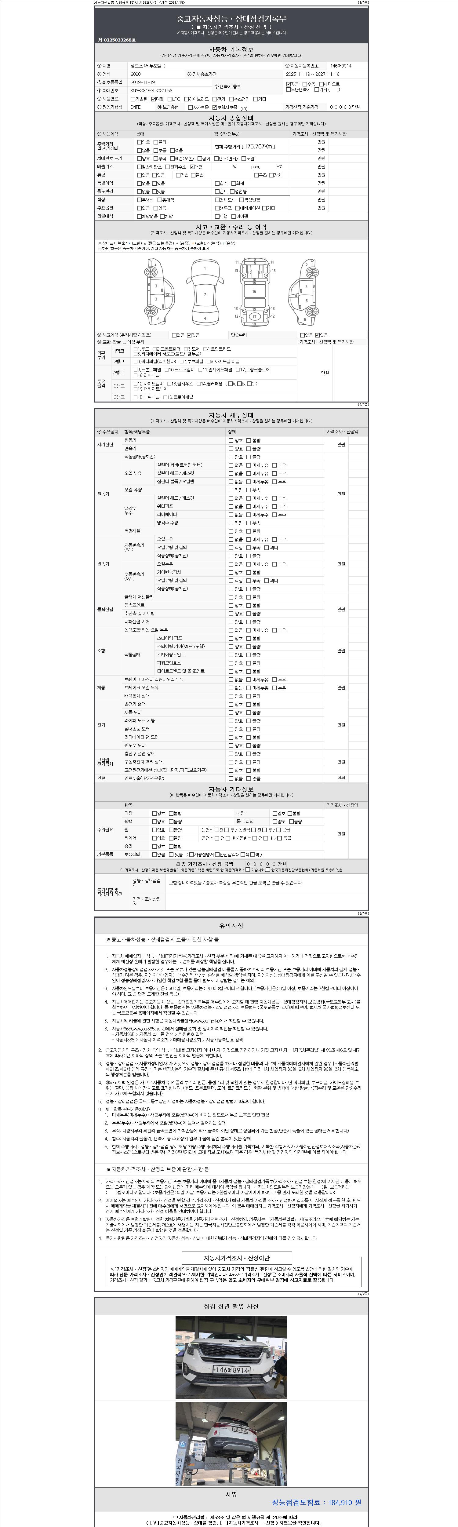 | 주행거리 | 175,757 km | 차량번호 | 146머8914 | 사고유무 | 성능기록부 참조 | 제시번호 | 제 2147483647 호 |