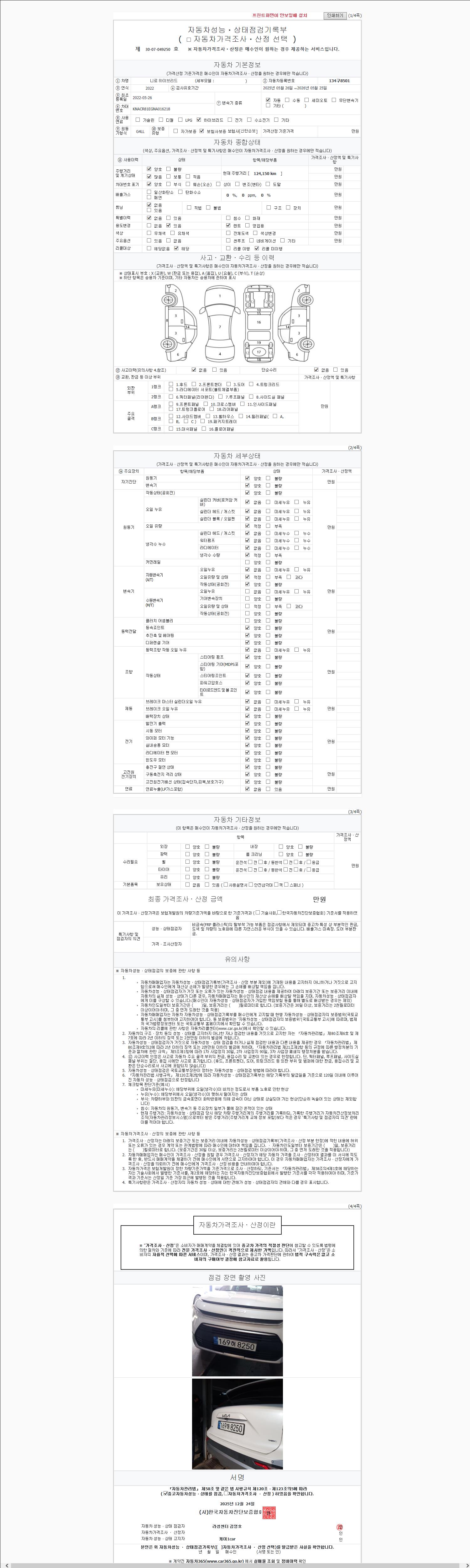 | 주행거리 | 124,150 km | 차량번호 | 134구8501 | 사고유무 | 성능기록부 참조 | 제시번호 | 제 2147483647 호 |
