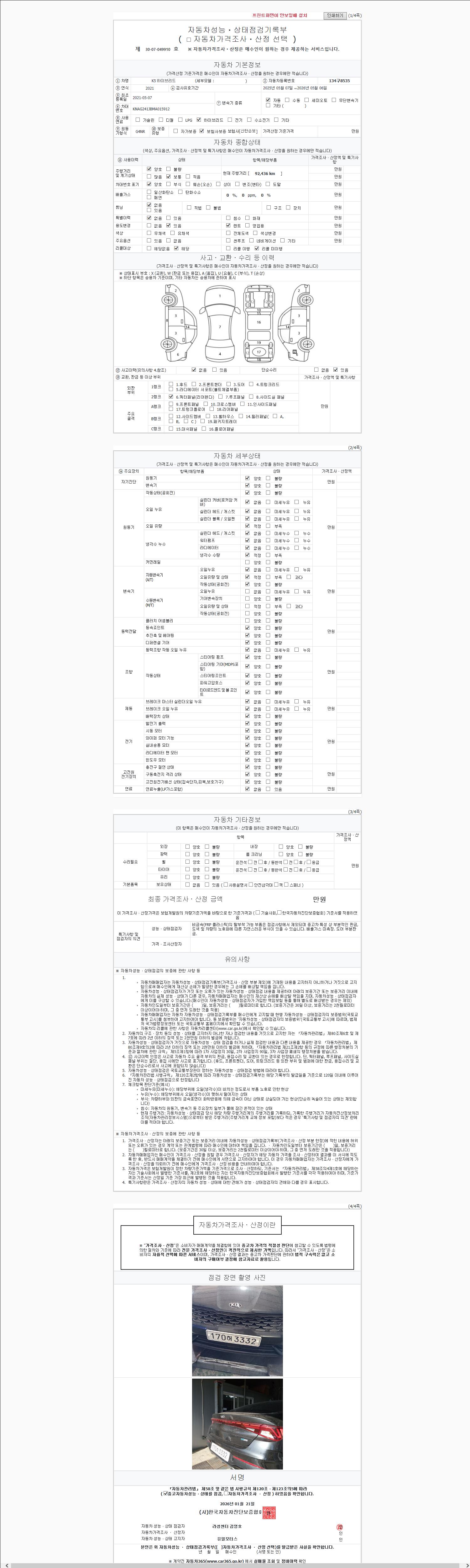 | 주행거리 | 92,436 km | 차량번호 | 134구8535 | 사고유무 | 성능기록부 참조 | 제시번호 | 제 2147483647 호 |