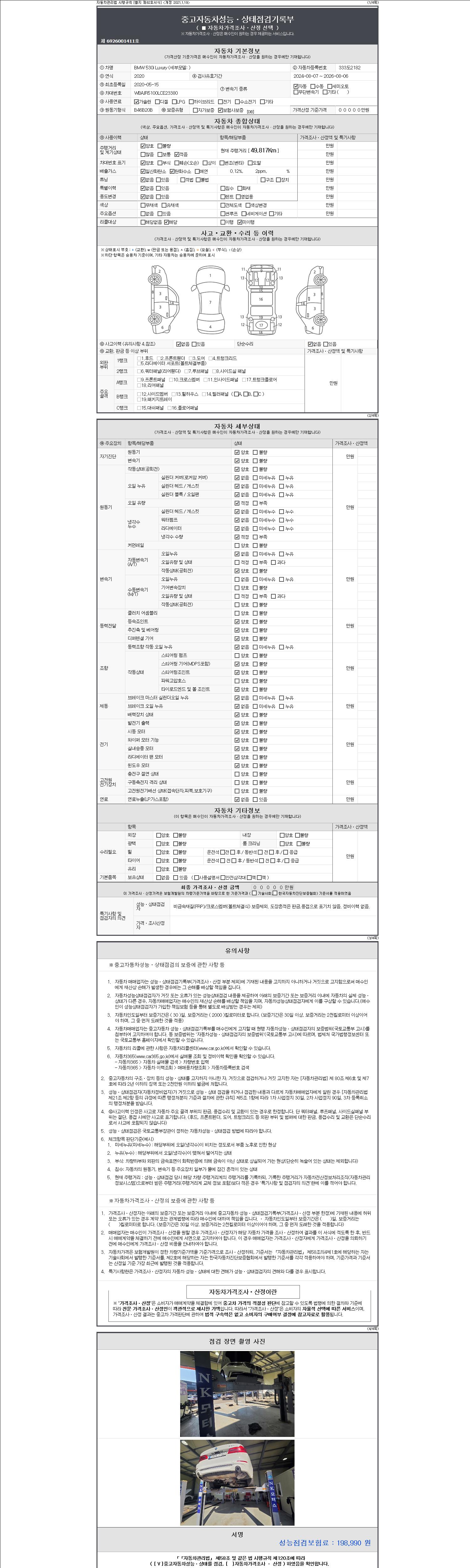 자동차관리법 시행규칙 제120조의 규정에 따라 별지 제 82호서식 《중고자동차 성능, 상태점검 기록부》를 발행한 성능, 상태점검자 및 매매자는 아래의 보증기간 또는 보증거리 이내의 중고자동차, 성능점검 기록부에 기재된 내용과 자동차의 실제 성능, 상태가 다른 경우 계약 또는 관계법령에 따라 매수인에 대하여 책임을 집니다.