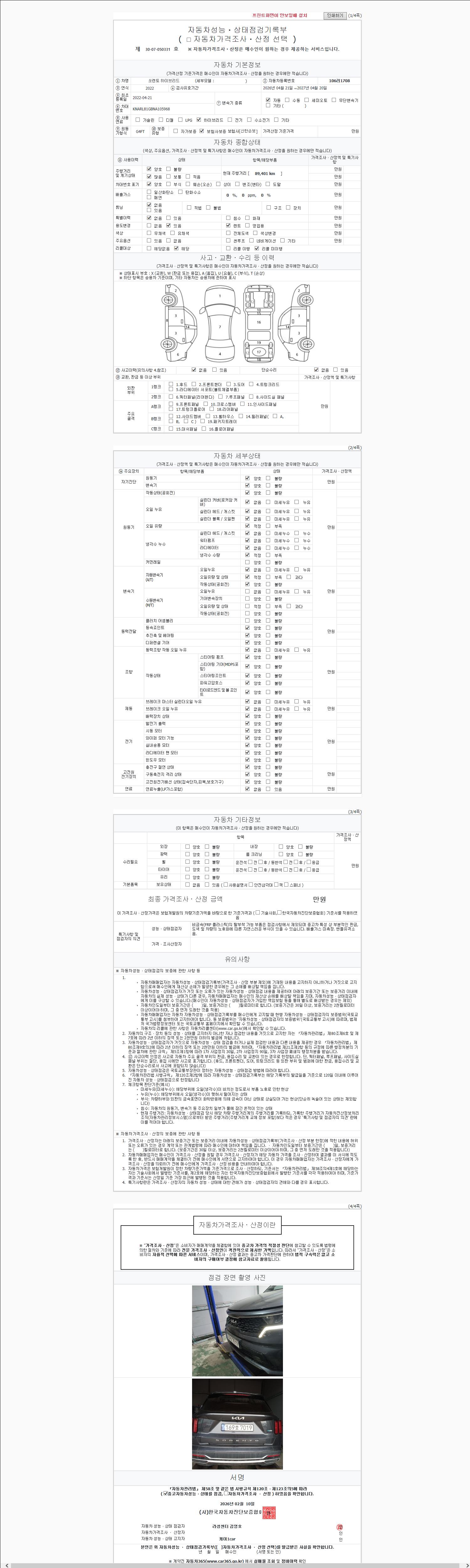 | 주행거리 | 89,401 km | 차량번호 | 106러1708 | 사고유무 | 성능기록부 참조 | 제시번호 | 제 2147483647 호 |