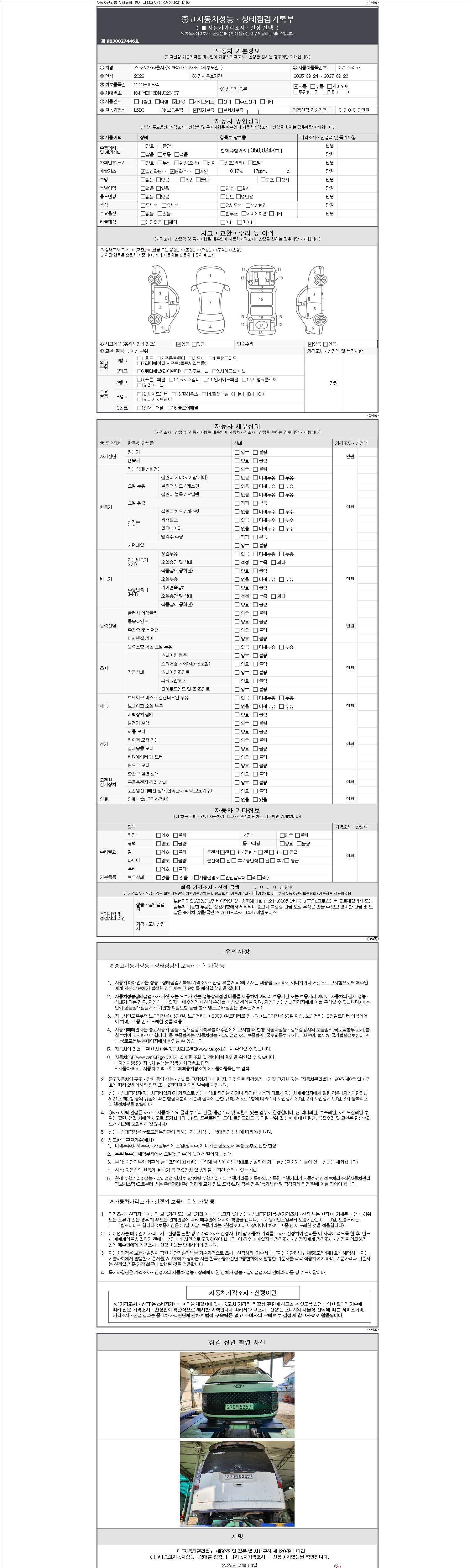 | 주행거리 | 350,824 km | 차량번호 | 270러5257 | 사고유무 | 성능기록부 참조 | 제시번호 | 제 2147483647 호 |