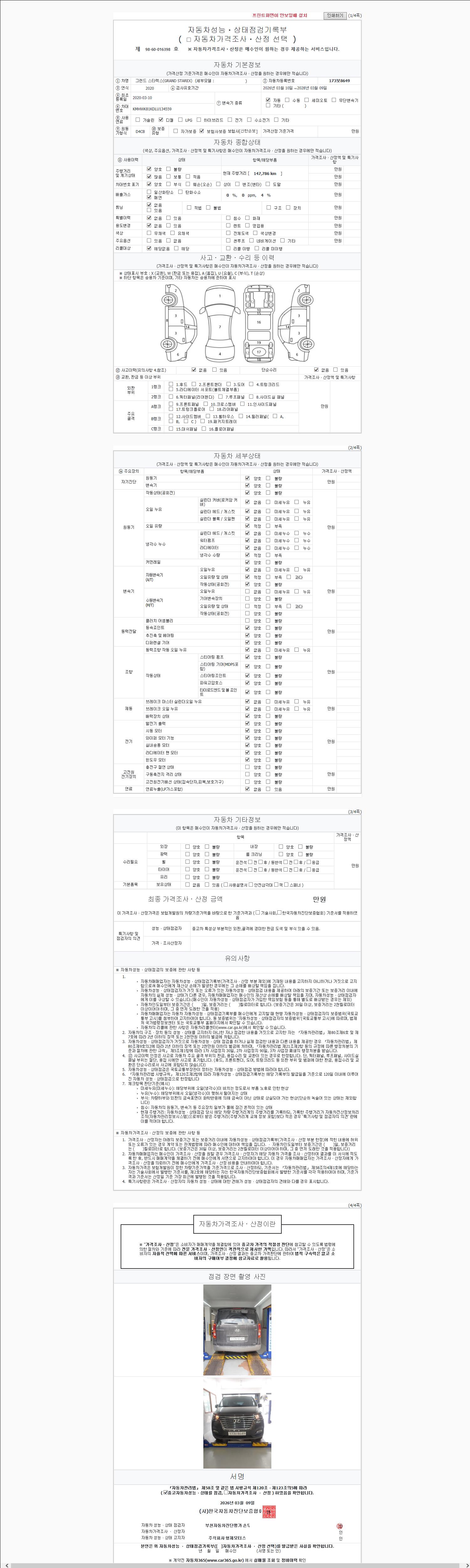 | 주행거리 | 147,786 km | 차량번호 | 173보8649 | 사고유무 | 성능기록부 참조 | 제시번호 | 제 2026043575 호 |