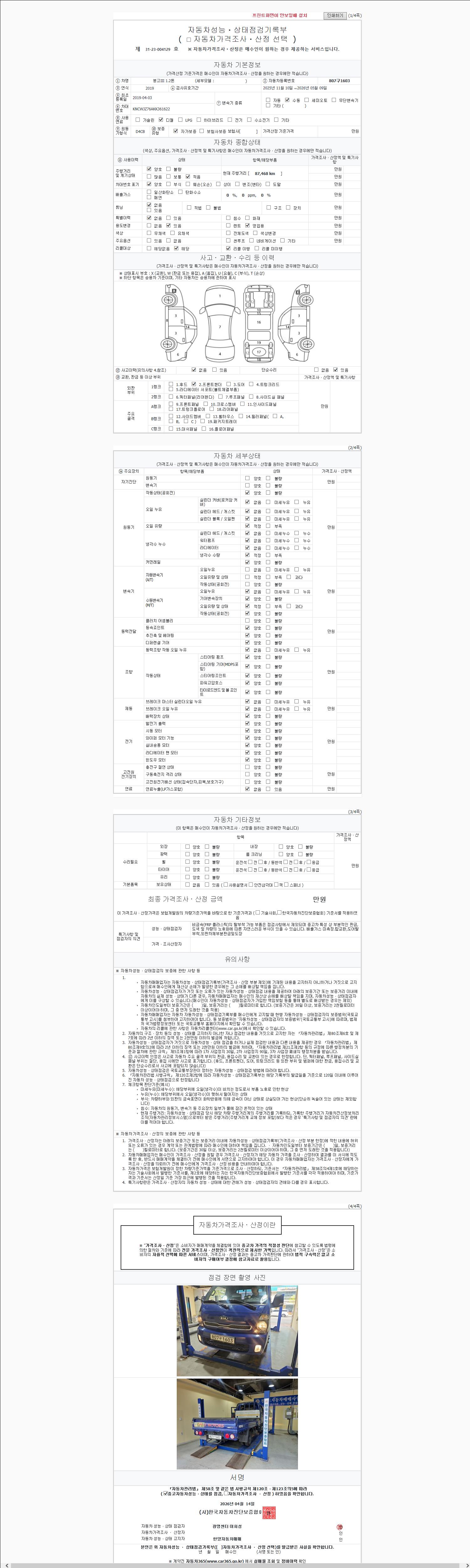| 주행거리 | 87,468 km | 차량번호 | 807구1603 | 사고유무 | 성능기록부 참조 | 제시번호 | 제 2147483647 호 |
