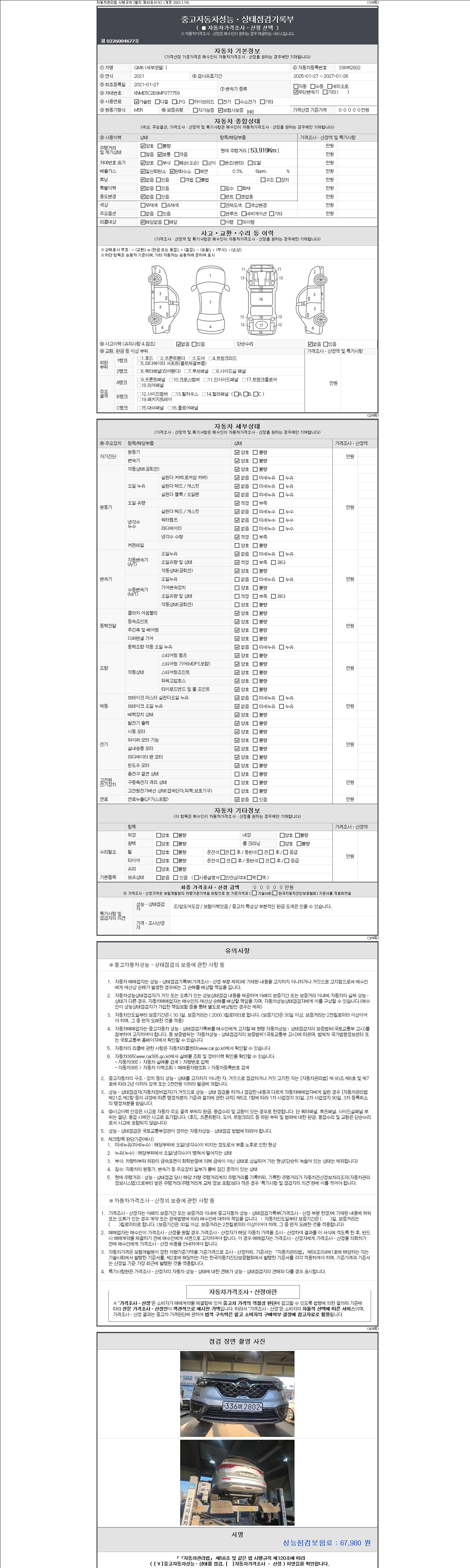 자동차관리법 시행규칙 제120조의 규정에 따라 별지 제 82호서식 《중고자동차 성능, 상태점검 기록부》를 발행한 성능, 상태점검자 및 매매자는 아래의 보증기간 또는 보증거리 이내의 중고자동차, 성능점검 기록부에 기재된 내용과 자동차의 실제 성능, 상태가 다른 경우 계약 또는 관계법령에 따라 매수인에 대하여 책임을 집니다.