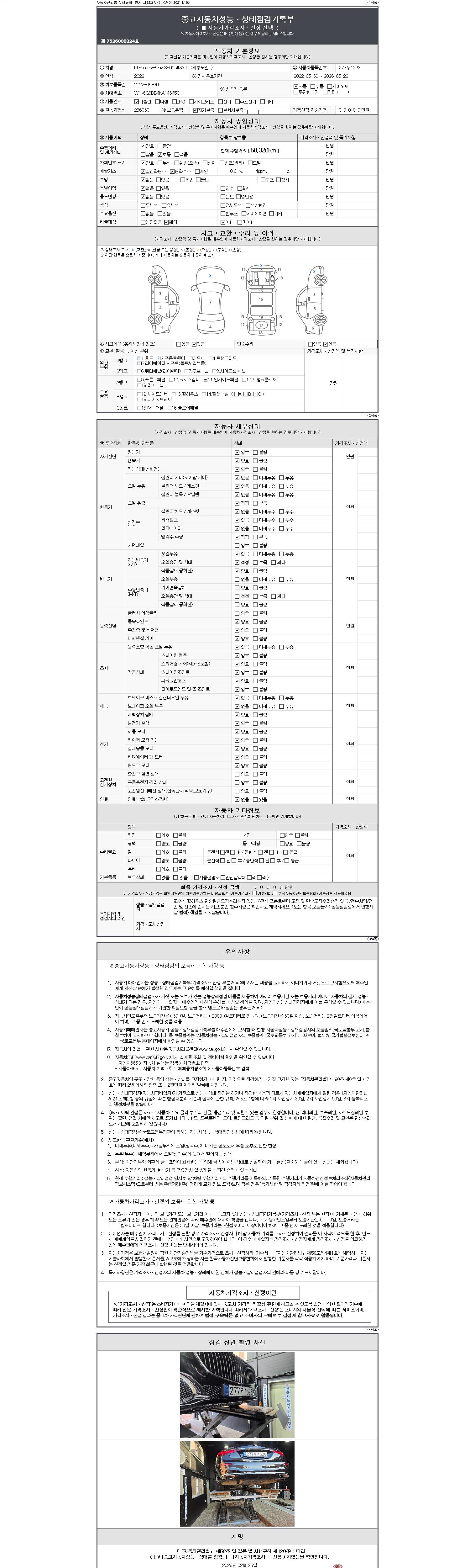 자동차관리법 시행규칙 제120조의 규정에 따라 별지 제 82호서식 《중고자동차 성능, 상태점검 기록부》를 발행한 성능, 상태점검자 및 매매자는 아래의 보증기간 또는 보증거리 이내의 중고자동차, 성능점검 기록부에 기재된 내용과 자동차의 실제 성능, 상태가 다른 경우 계약 또는 관계법령에 따라 매수인에 대하여 책임을 집니다.
