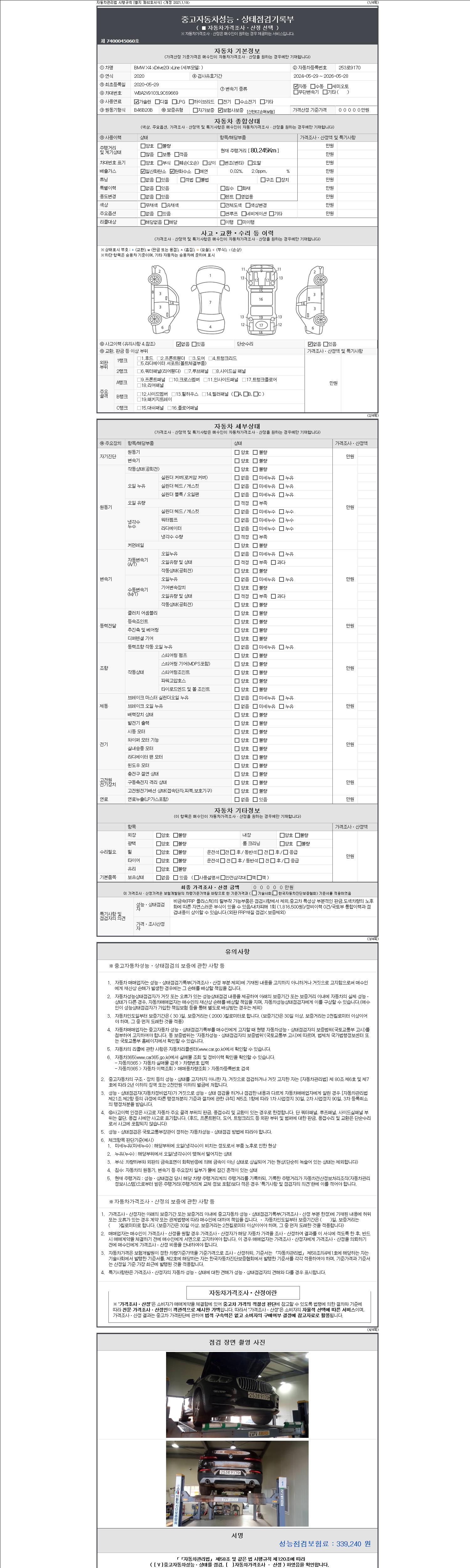 자동차관리법 시행규칙 제120조의 규정에 따라 별지 제 82호서식 《중고자동차 성능, 상태점검 기록부》를 발행한 성능, 상태점검자 및 매매자는 아래의 보증기간 또는 보증거리 이내의 중고자동차, 성능점검 기록부에 기재된 내용과 자동차의 실제 성능, 상태가 다른 경우 계약 또는 관계법령에 따라 매수인에 대하여 책임을 집니다.